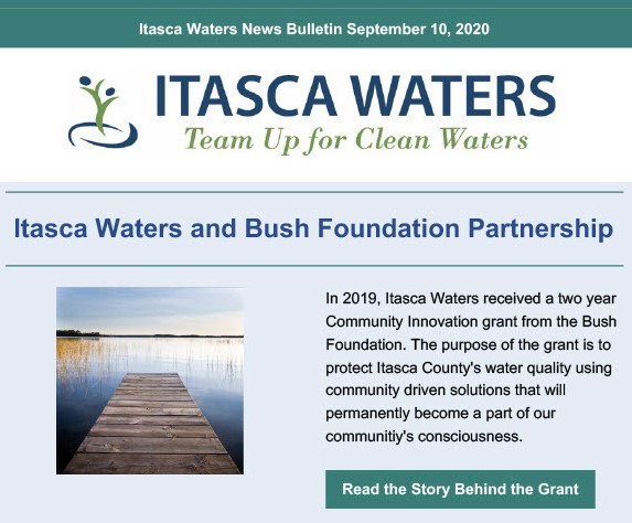 Itasca Waters's September News Bulletin outlines the Community Innovation Grant received from the Bush Foundation in 2019. The purpose of the grant is to protect Itasca County's water quality using community driven solutions. Check out some of the Key Findings so far in this bulletin. If you haven't done so already, consider signing up to receive our quarterly newsletters and bulletins directly via email! If you can't access the bulletin below click here for the newsletter in it's entirety.